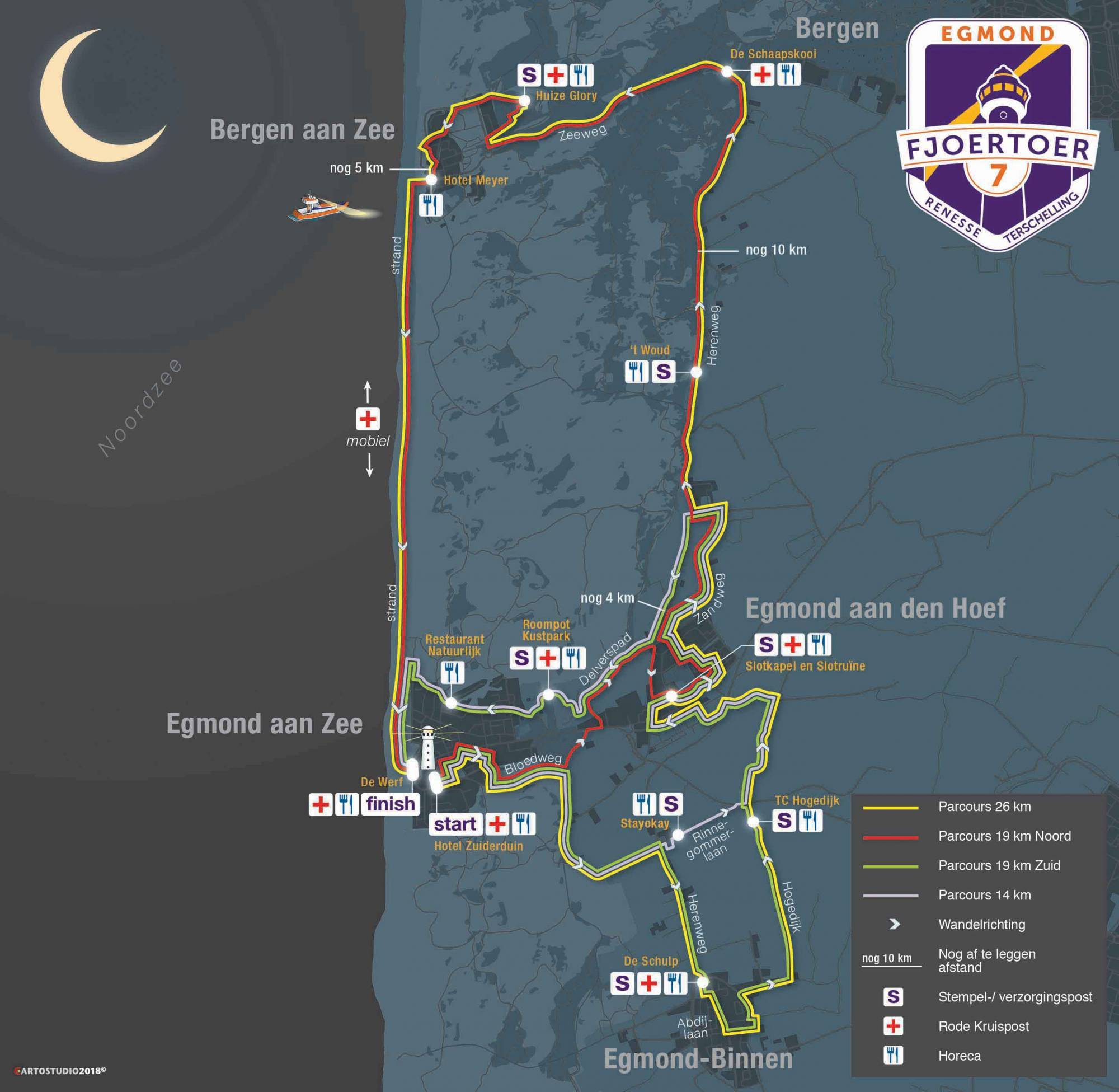 Participants on the 19 km North route walk directly to Egmond aan den Hoef to the Slotruine. From Egmond aan Zee, the course in the dune area is headed eastwards via the Bloedweg. The 26 and 19 km South participants then go via the van Oldenborghweg and Herenweg to Egmond-Binnen. After that they go via the Hogendijk to Egmond aan den Hoef. The shortest distance of 14 km goes in the direction of Egmond-Binnen via the Bloedweg. Afterwards the Rinnegommerlaan is followed to Egmond aan den Hoef. Then via the Zandweg and back via the Herenweg to Nachtegalenpad and the north side of Egmond aan Zee, where the last part goes along the beach.