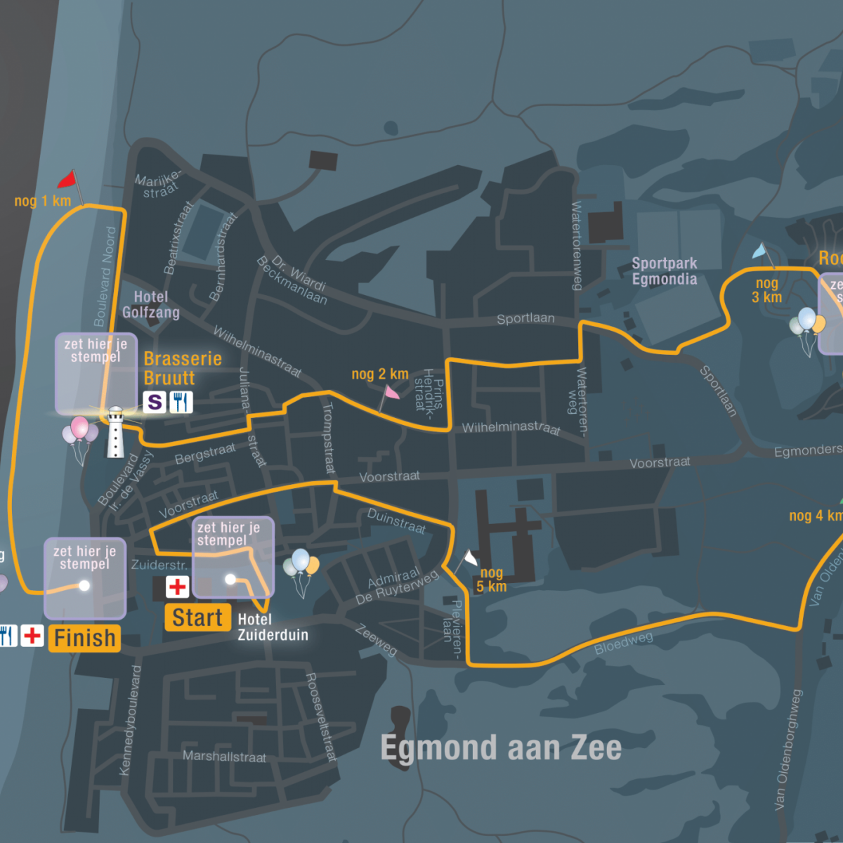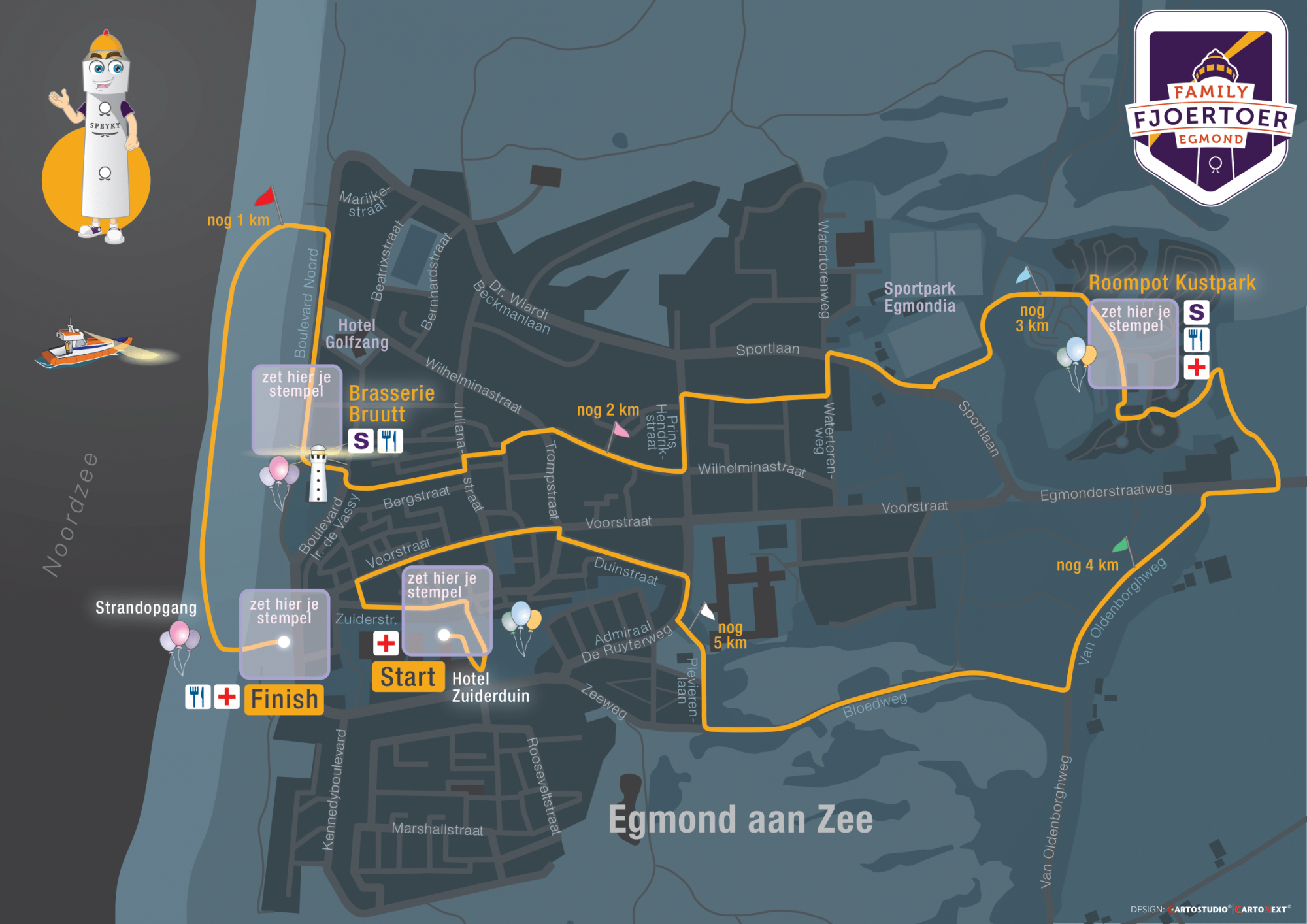 The Family Fjoertoer has one distance, a 6 km walk through Egmond aan Zee. A large part of the route of the ‘big’ Fjoertoer is used for this. The Family Fjoertoer starts at Hotel Zuiderduin and finishes at the main beach entrance in Egmond aan Zee.