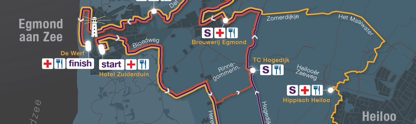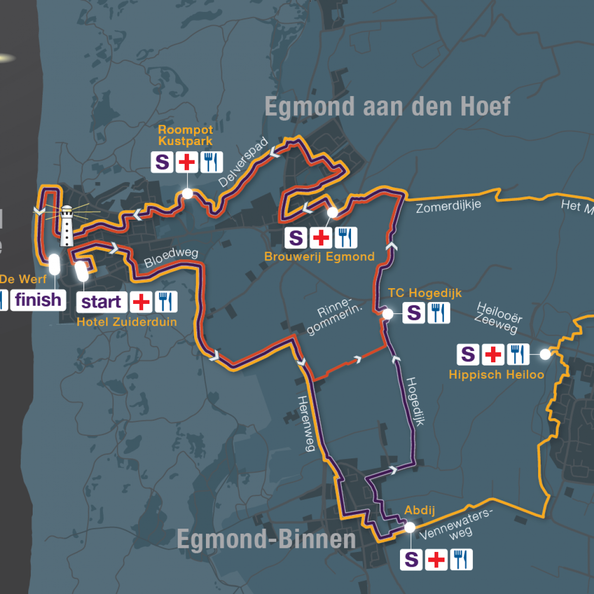 Vanaf de start bij Hotel Zuiderduin wandel je door Egmond aan Zee richting de Bloedweg, waar je het duingebied betreedt. Door de polder ga je richting de eerste stempelpost bij TC Hogedijk. Hier is ook ruimte om even lekker uit te rusten voordat je aan je tocht naar de andere kant van Egmond aan den Hoef begint. De tweede stempel haal je bij Brouwerij Egmond, waar je onder het genot van een Fjoertoer biertje kunt genieten van de gezelligheid. In Egmond aan den Hoef staat nog veel meer te beleven, want deze straten staan bekend om hun enthousiaste bewoners die er jaarlijks een waar spektakel van maken.